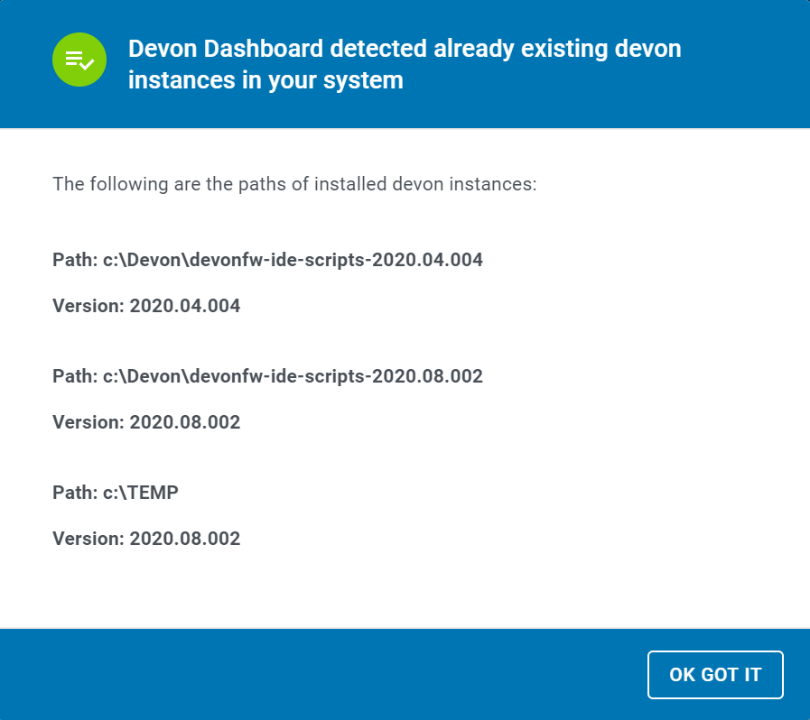 The first time you open the application you will get a dialog with all the devonfw distributions found on your machine. Click on OK GOT IT to continue.