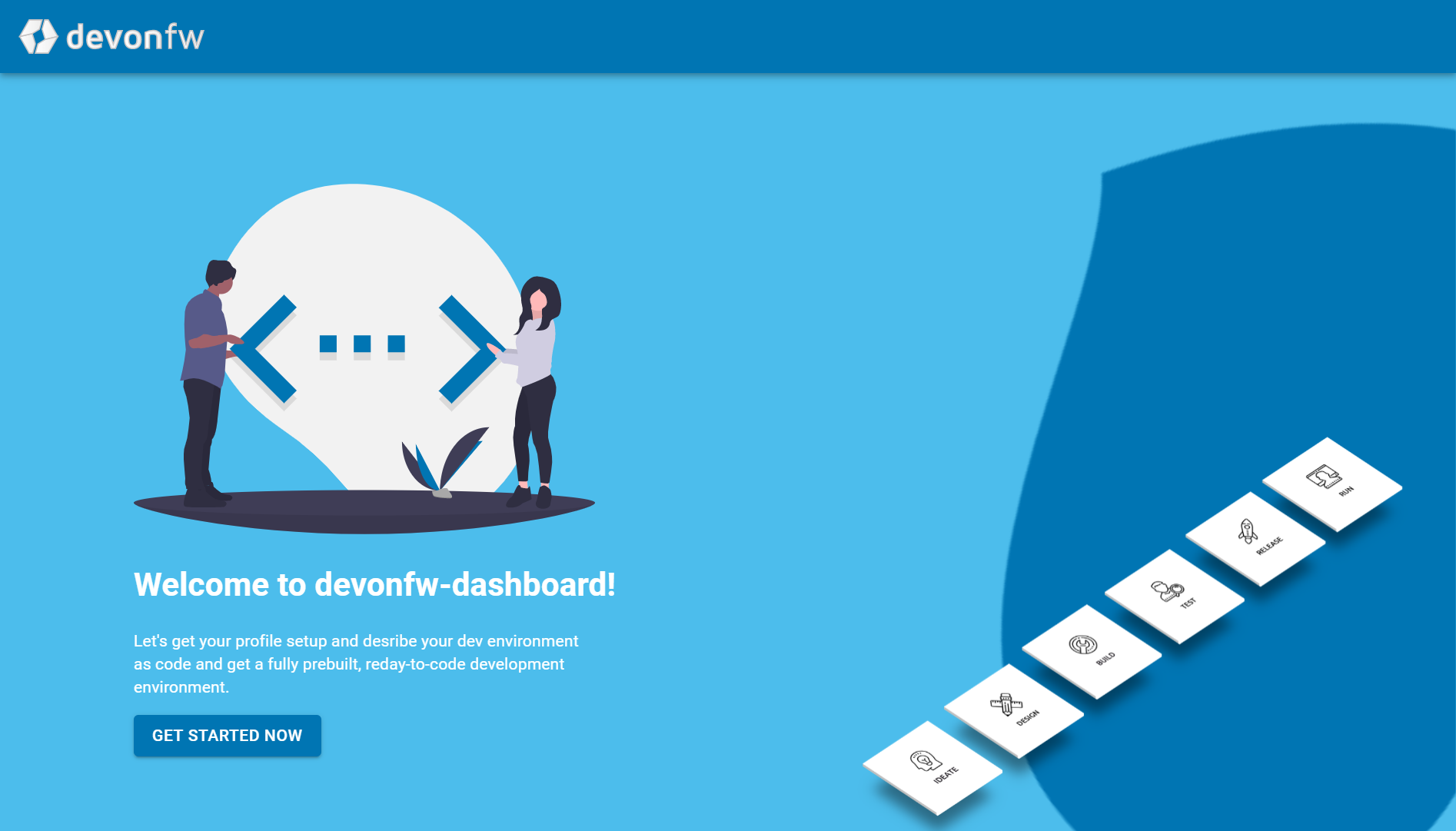 This is the entry point of the devonfw dashboard. Click on GET STARTED NOW to start using it.